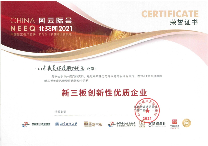 公司在2021年第五屆中國(guó)新三板年度風(fēng)云榜評(píng)選活動(dòng)中,經(jīng)過系統(tǒng)評(píng)分和組委會(huì)專家打分后綜合評(píng)定后,榮獲新三板創(chuàng)新性優(yōu)質(zhì)企業(yè)。