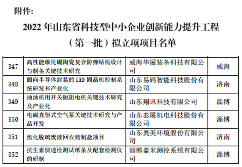 7月1日,山東省科學(xué)技術(shù)廳對(duì)2022年山東省科技型中小企業(yè)創(chuàng)新能力提升工程(第一批)擬立項(xiàng)項(xiàng)目名單進(jìn)行公示,其中山東奧美環(huán)境股份有限公司申報(bào)的“焦化脫硫廢液回收精制鹽項(xiàng)目”入選。