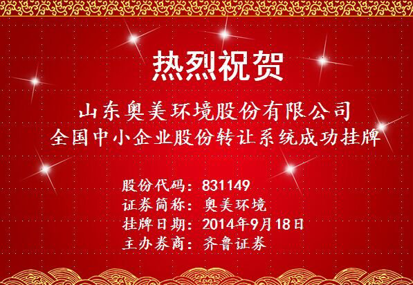 今天是2014年9月18日,山東奧美環(huán)境股份有限公司(Shandong AMS Environmental Co. , Ltd.)在全國(guó)中小企業(yè)股份轉(zhuǎn)讓系統(tǒng)成功掛牌,股票簡(jiǎn)稱: 奧美環(huán)境;股票代碼:831149.